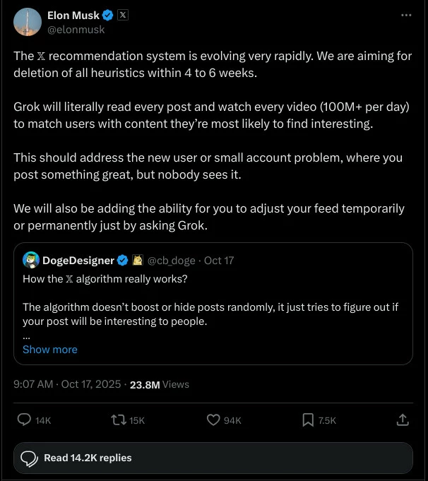 Musk is changing his social media platform again. This time, he's removing all heuristics (aka LIKES) from posts and letting Grok the AI bot decide what users will see in their feeds. As one might expect, many long-time Twitter/X users are in an uproar. But we shall see in a few weeks how all this Grok stuff pans out.