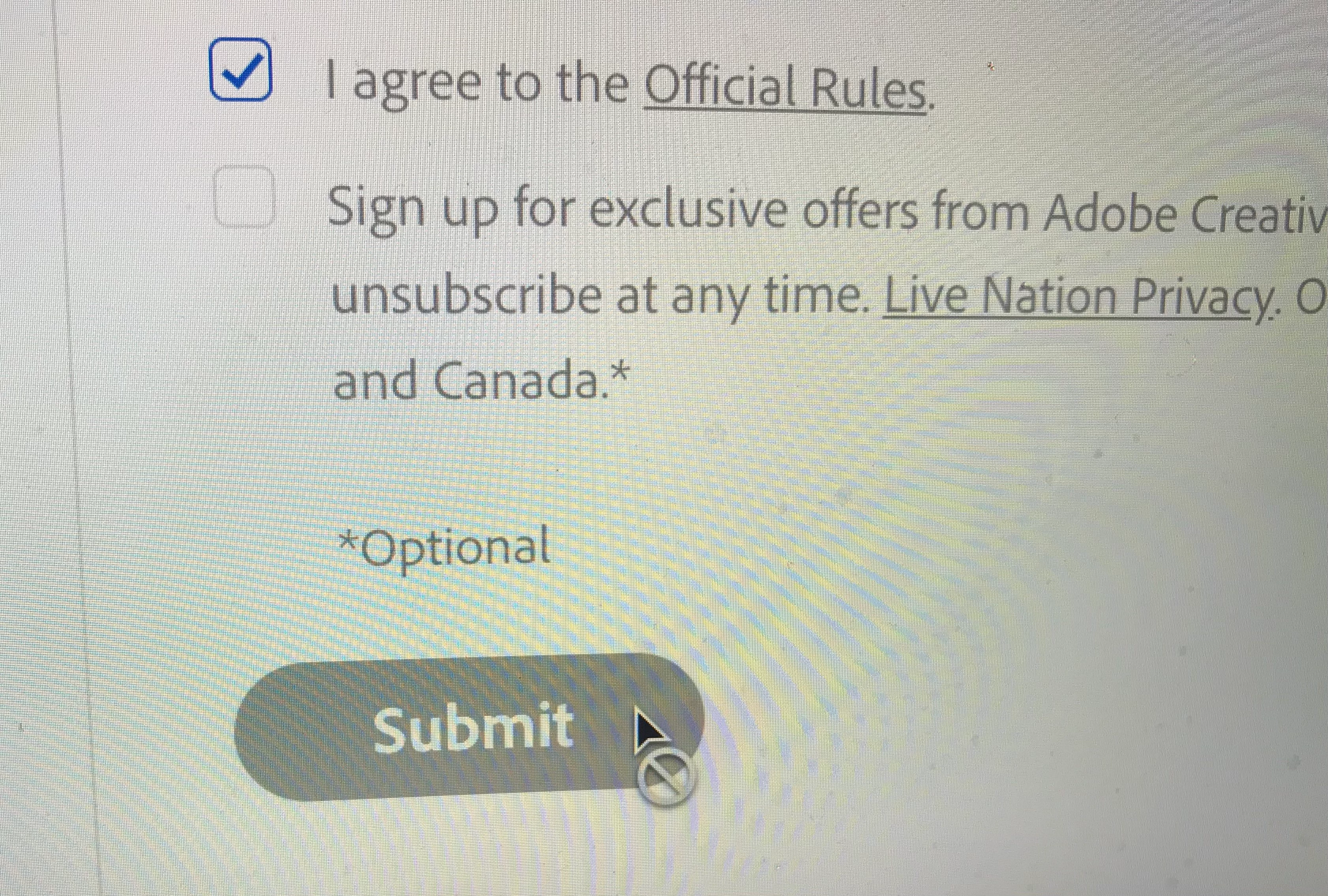 After filling out the form, the submit button literally remains unclickable. This is exrtemely frustrating and I can't tell if I'm the only person in the world having this problem, but there's no way I'm missing out on this contest for something that has nothing to do with me.