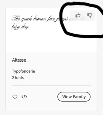 Can you please remove the thumbs up & down icon or move it to another location so that it is not covering the font preview window? As you can see in the image i've attached, it's partially covering the font. It's also annoying and distracting. Thank you.
