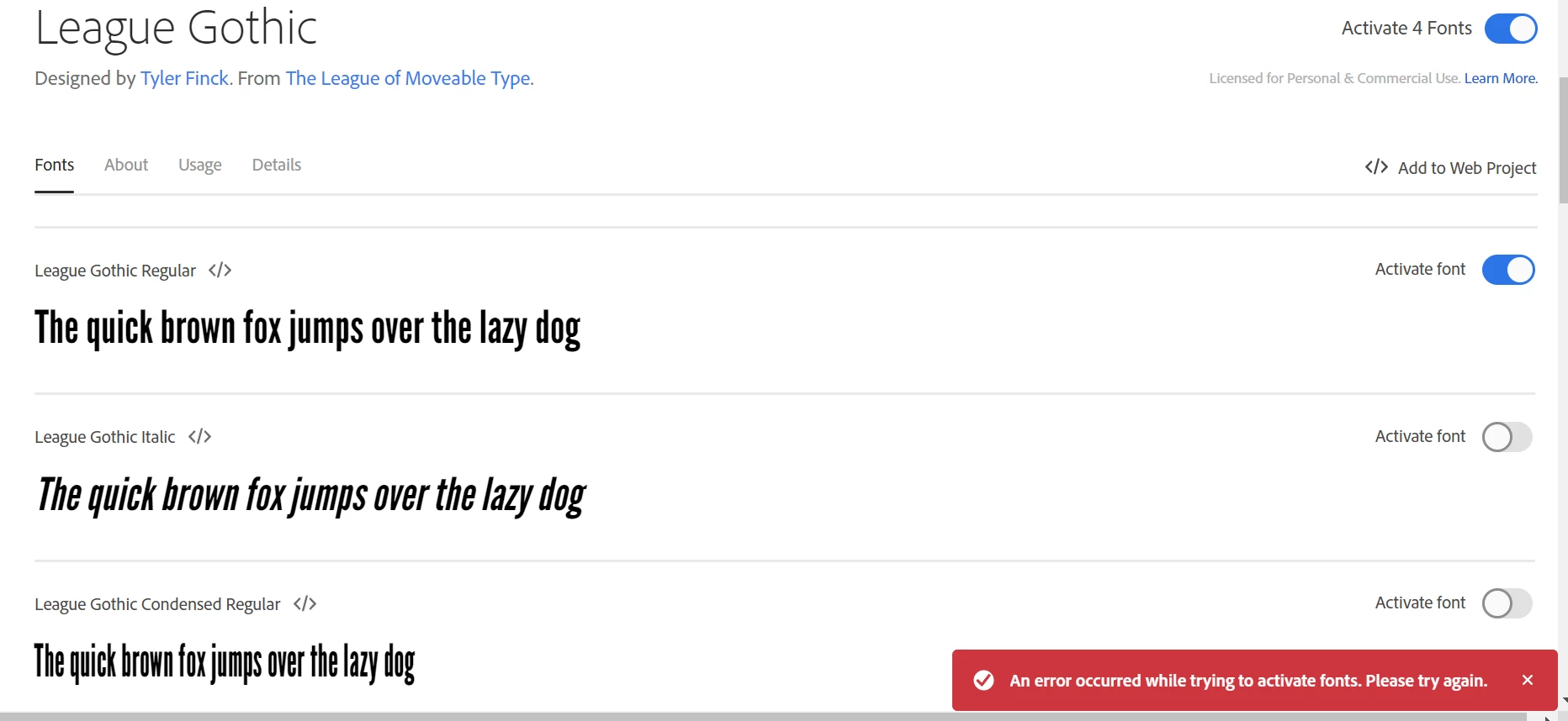 I have been trying to get these two Adobe Fonts to use: (League Gothic & Roboto Slab). When trying to activate them through my web browser I keep getting the error:
