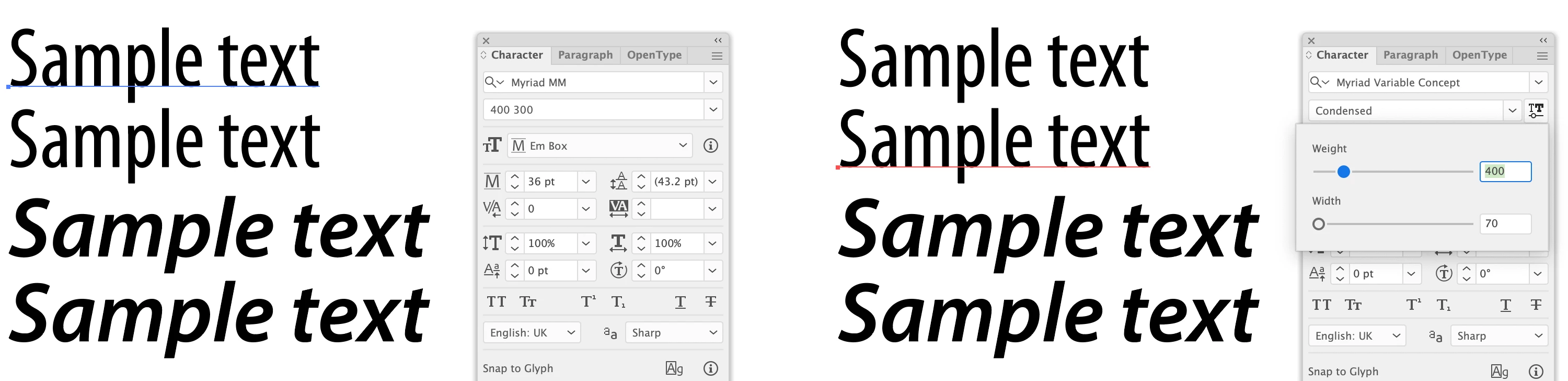 • Myriad Variable 400 WT 70 WD (OpenType Variations)