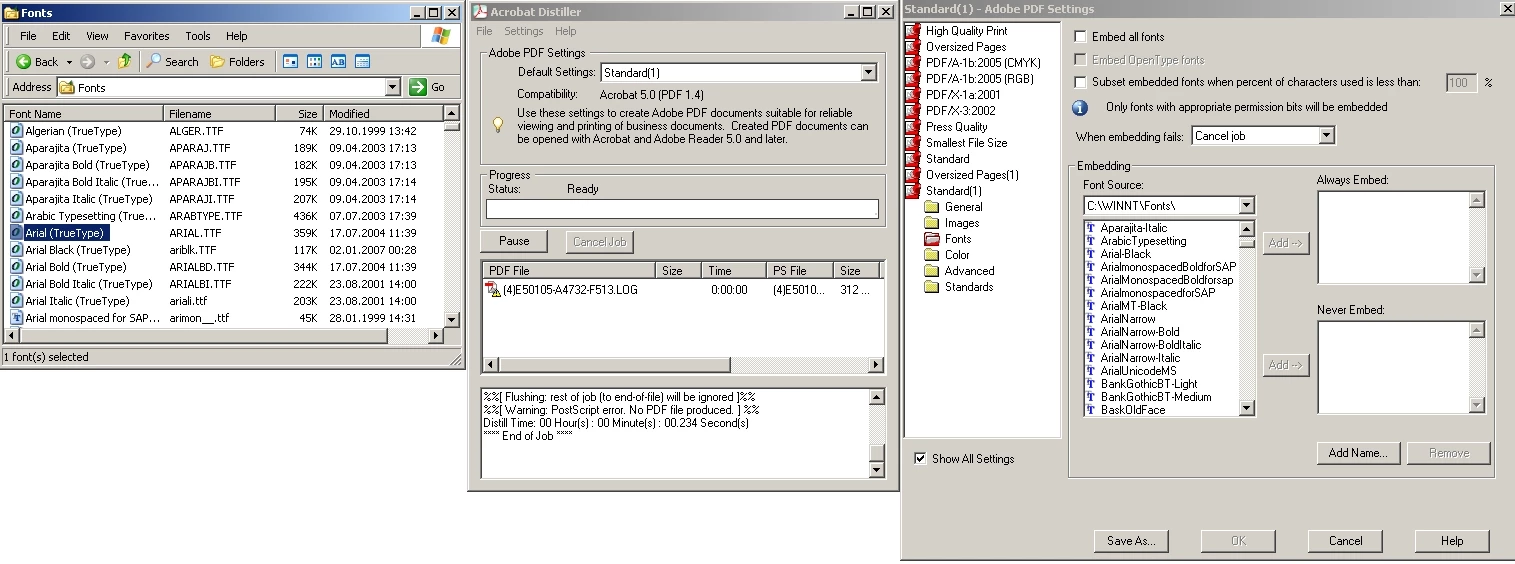 Distiller failed to PDF a .ps file. Arial not found, using Courier.