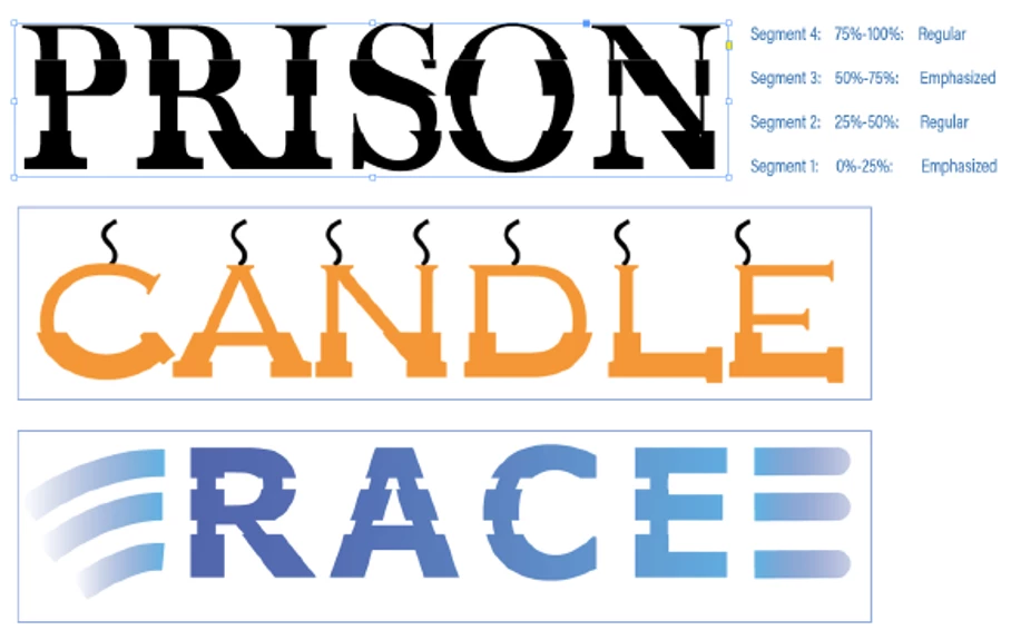 In terms of workflow, the user selects the font, say regular, and defines the segment marks in terms of how low it is from the font ascender line. Let say he marks two points at 20% and 50% above from the fonts descender (total font height=ascender-descender). This will generate three segments. For each segment he then may choose a different typeface to be replicated. For example, he may choose Bold-Italic-Bold. This will even be possible if the designer does not have the bold and italic typefaces of the font. In such cases, it will replicate a false bold in the first segment, a false italic in the middle segment and a false bold in the third segment. In case the user has the required typefaces of the font family, then that portion of the glyph will be taken from the corresponding font. The user may choose any typeface like semi-bold, semi-italic, condensed etc
