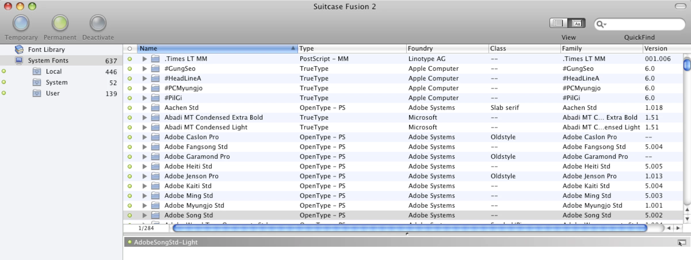 I am attaching a screenshot of Suitcase Fusion showing some of the fonts,