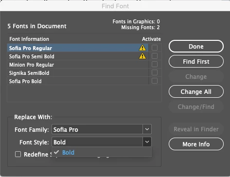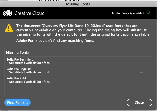 CC app shows Sofia Pro fonts as activated and a browser login to Adobe also shows them active. ID says no, and oddly it can find one font style but not all the others (and this only after quit/relaunch of both CC and ID. Of course these are my client's brand fonts and I'm on deadline.