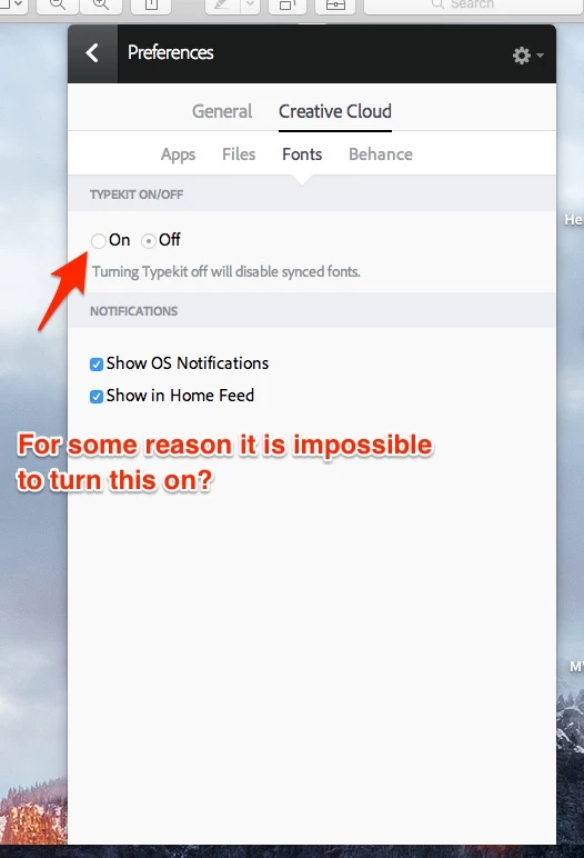Jjaakkov48275547ParticipantForum|Forum|10 years agoNovember 2, 2015QuestionHi, my typekit is impossible to TURN ON in Creative Cloud using desktop software. What should I do?Forum|Forum|10 years agoNovember 2, 20153 replies384 views