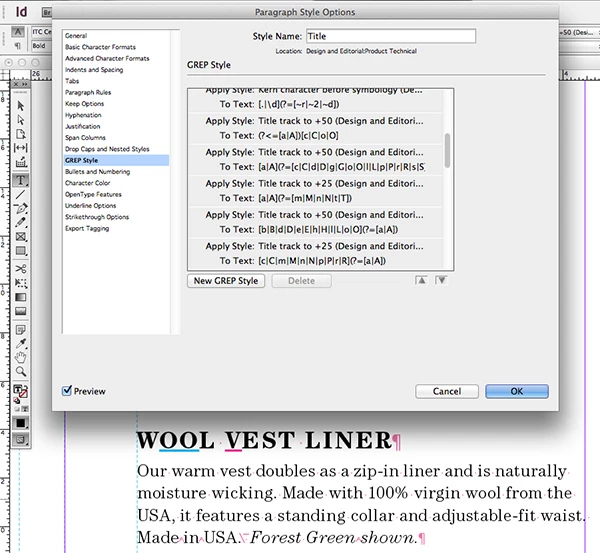 But, there you go! So far so good. No expensive typographer to build a custom kern table. And, no script to maintain and debug, and, the tracking values are built into the style so they can't be accidentally blown away by re-applying the paragraph style. And, if I organize my paragraph styles properly, I only have to build these overrides once (i.e., any paragraphs that are all caps and use a specific tracking value, all use the same GREP override combinations, so if I base them all off a master paragraph style, then any changes to the master ripple through the entire document...I love the Based On option!).