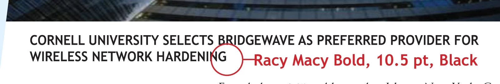 I need to find a font called 'Racy Macy.' I was told that our collateral was created using InDesign on a Mac. Here is a sample of the file: