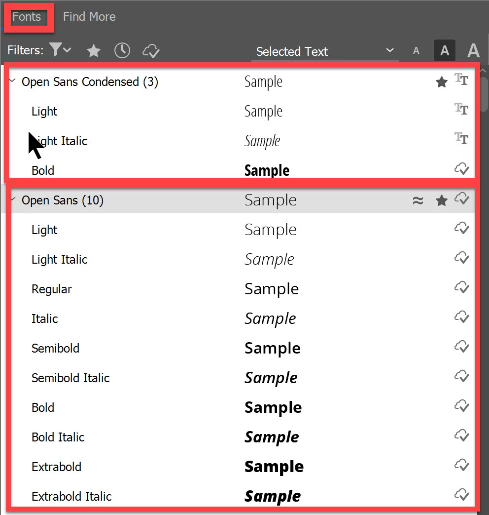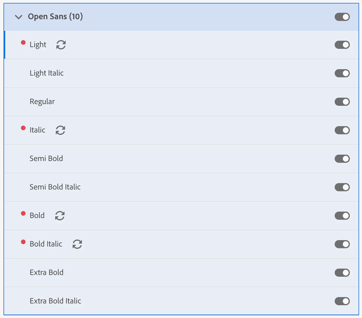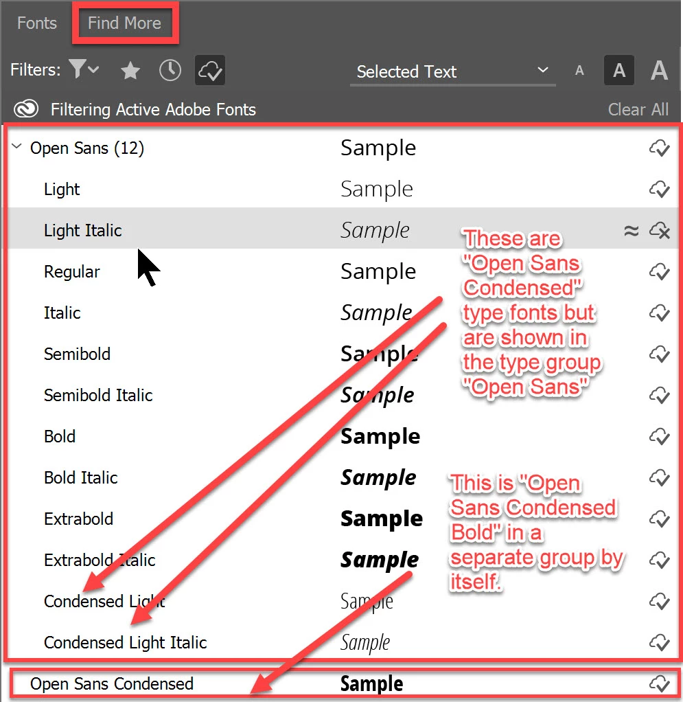 But in the Creative Cloud font dashboard, I see there are problems with some of the weights. (light, italic, bold, bold italic)