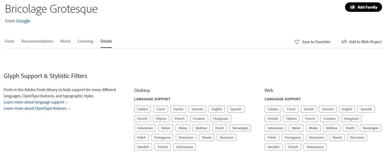 When I go to the page for an individual family as requested, I don't see the full character set, but a list of supported languages.