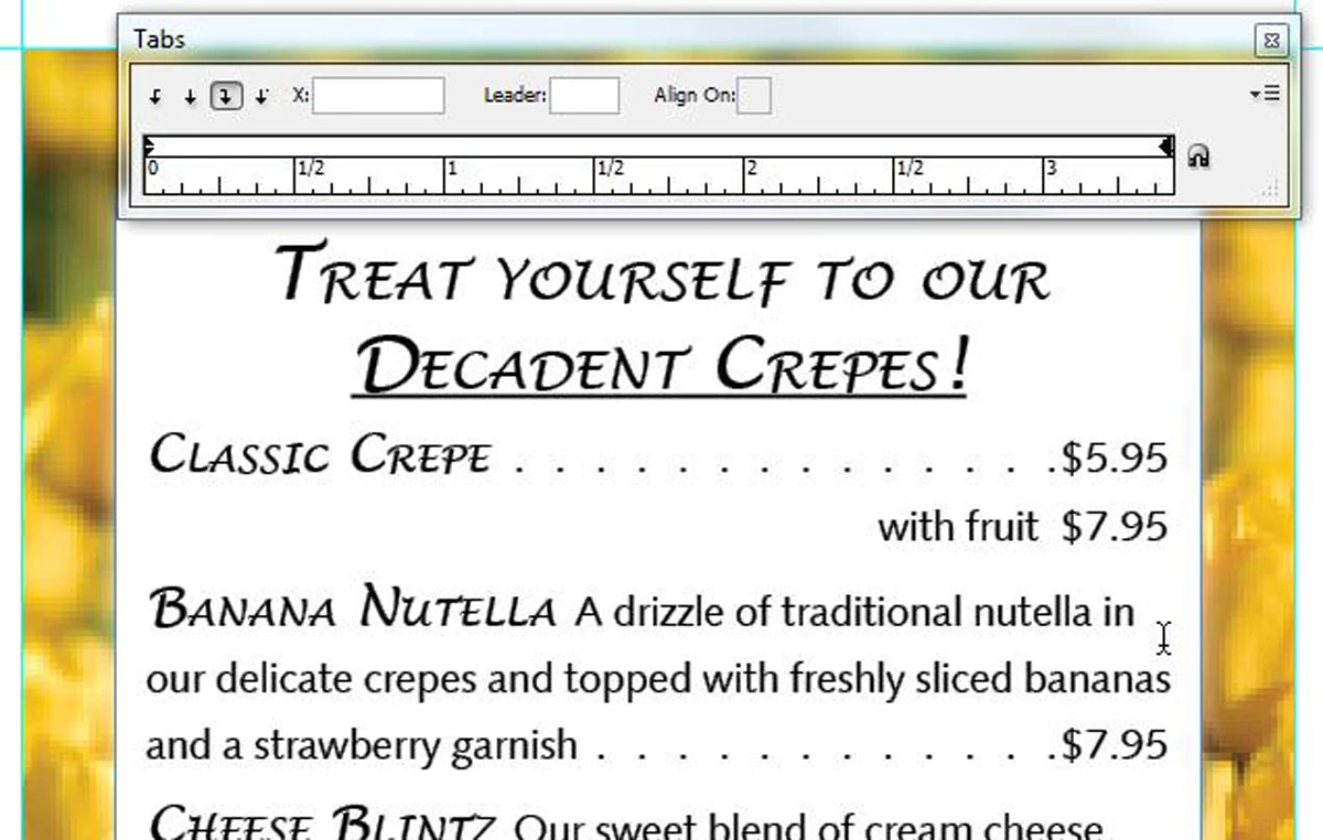 In the feature card pictured, I need the item description to kick down to the next line at the 3" mark, while the prices all right align as shown at about the 3.4" mark. Because the descriptions change frequently, I'd rather not make the adjustments manually to each item. I work with a lot of different (printed) restaurant menus, and this problem has became a recurring theme. Any help would be apprectiated.
