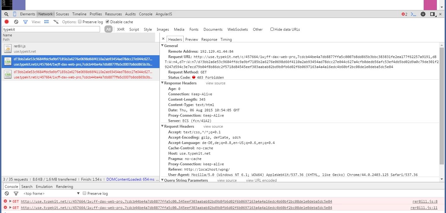 I'm trying to use one typekit font and can't figure out why the loading of the css ends up in "403 forbidden" responce.