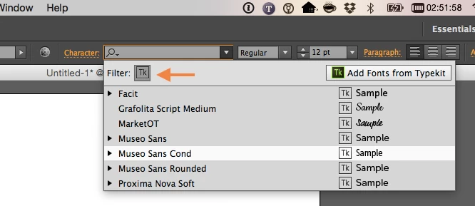 - a screenshot of the font menu in Illustrator with the Typekit filter turned on, similar to this one: