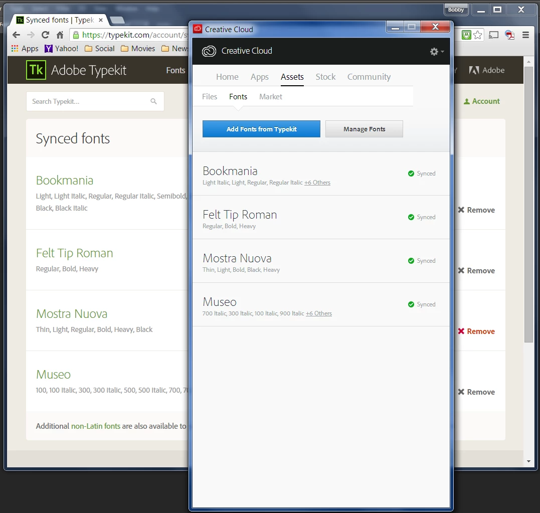 One really funny thing (if you can laugh at it) is when I sign out of the Creative Cloud control panel and then sign back in to refresh those Typekit fonts I'll get a CC pop up message on my taskbar saying "X number of fonts were added and the regular weight of Mostra Nuova was removed." Really? Why is it getting removed? That is exactly what I do NOT want.