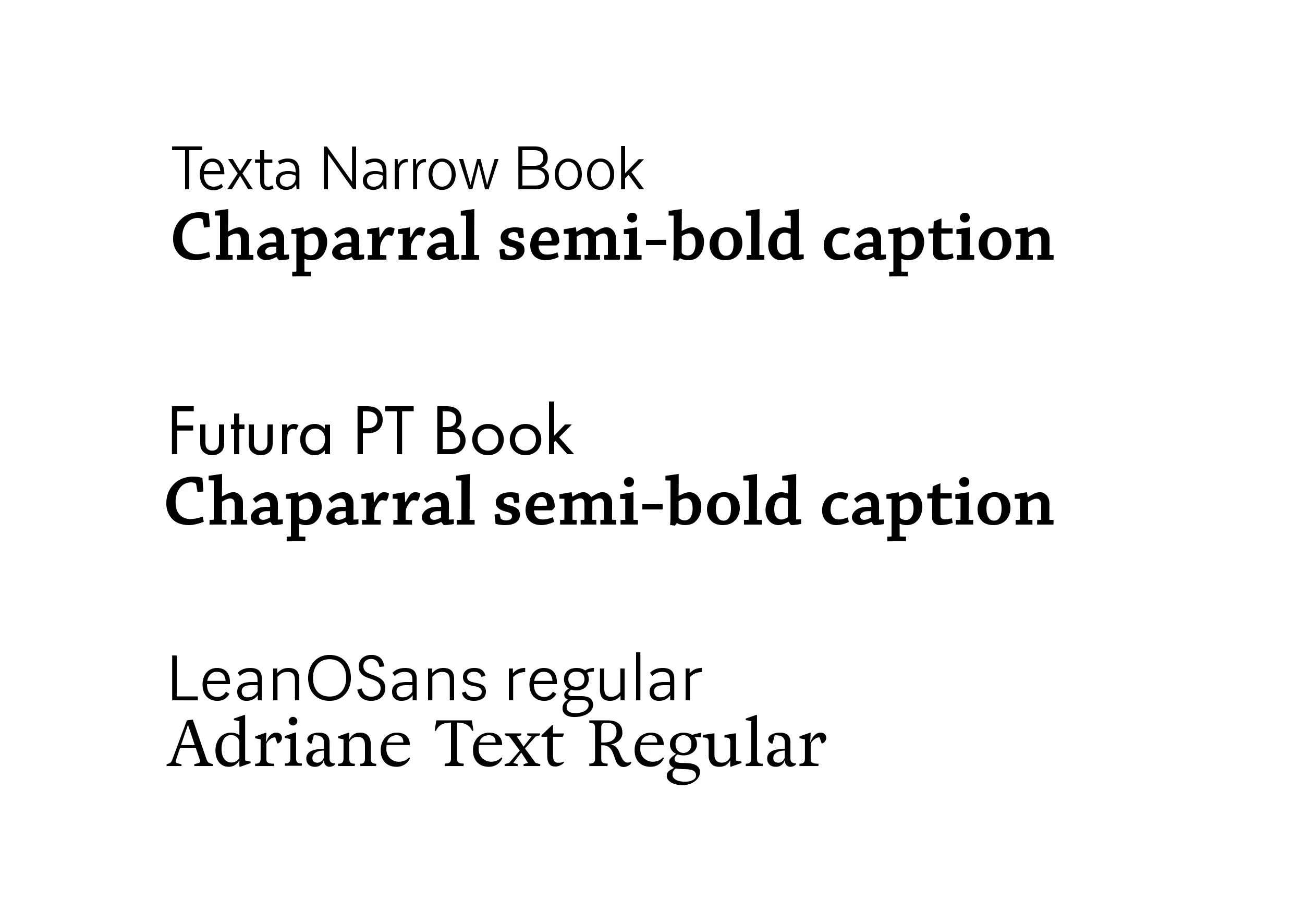 I am thinking suggesting some geometric typefaces that arent to far away from Helvetica and thought of using the following - maybe Texta Alt Book with Chapparel, LeanOSans with Adriane or maybe playing it safer with Futura and Chapparel (which I know is widely regarded as complementary). I think the Texta option look good together but I am was terrible at typography at uni so would love to hear anyones opinion on this or maybe even an alternative to the Texta Typeset.