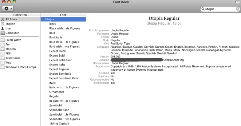 Unfortunately I haven't been able to determine any information about other than the information on the screen shot above. The creation date on the Utopia file itself is 6/9/99. The most baffling thing is the version, 1.002 which doesn't seem to match anything I can find on the Adobe website. If anyone can help me match the font to its original product(s) it would be a great help. Especially since there are dozens of adobe fonts in the same folder.