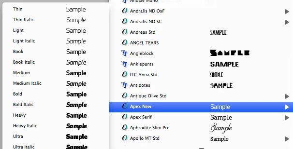 my fonts, of the same name, often show up seperately. i.e. helvetica neue light and helvetica neue bold show up seperatley (fig. 1 is example). i just want all of my fonts of the same name in one pop-out menu (fig. 2 is example). please help.