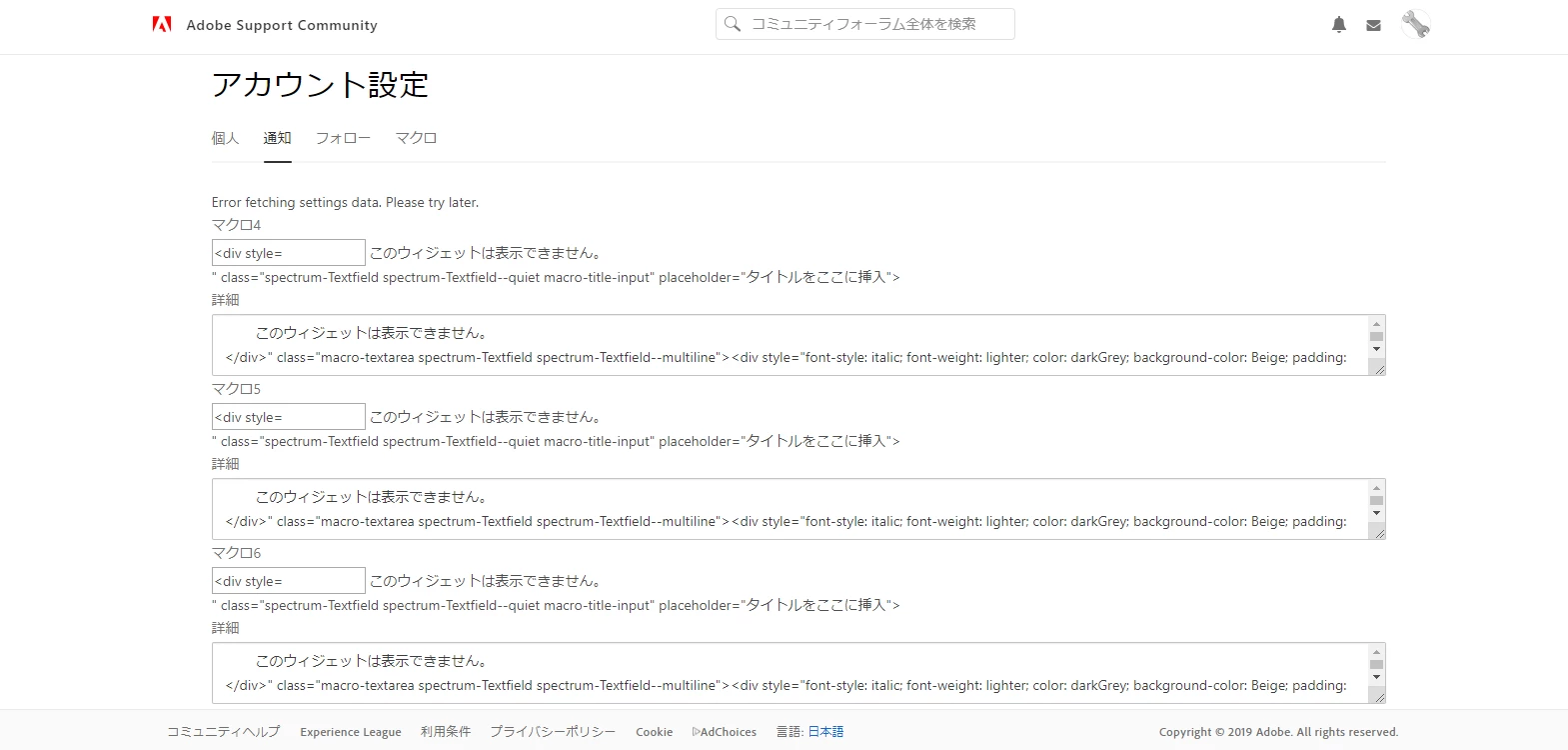 After clicking on my avatar in the upper-right corner and doing Account Settings, then waiting for a couple of minutes, I get "Error fetching settings data. Please try later":