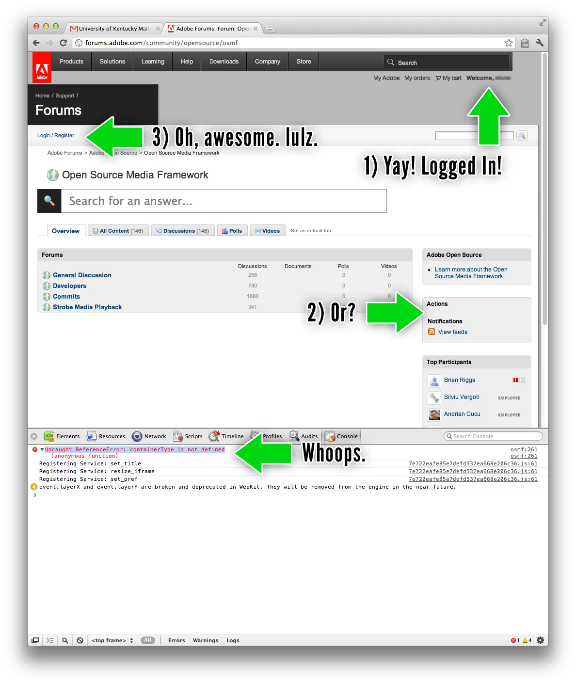 The forum is very confusing for new users, and throws a JavaScript exception if you aren't logged into adobe.com AND the forum content well below the header.