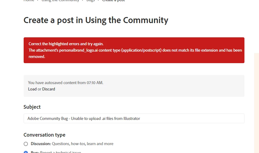 Adobe Community Bug - Unable to upload .ai files from Illustrator