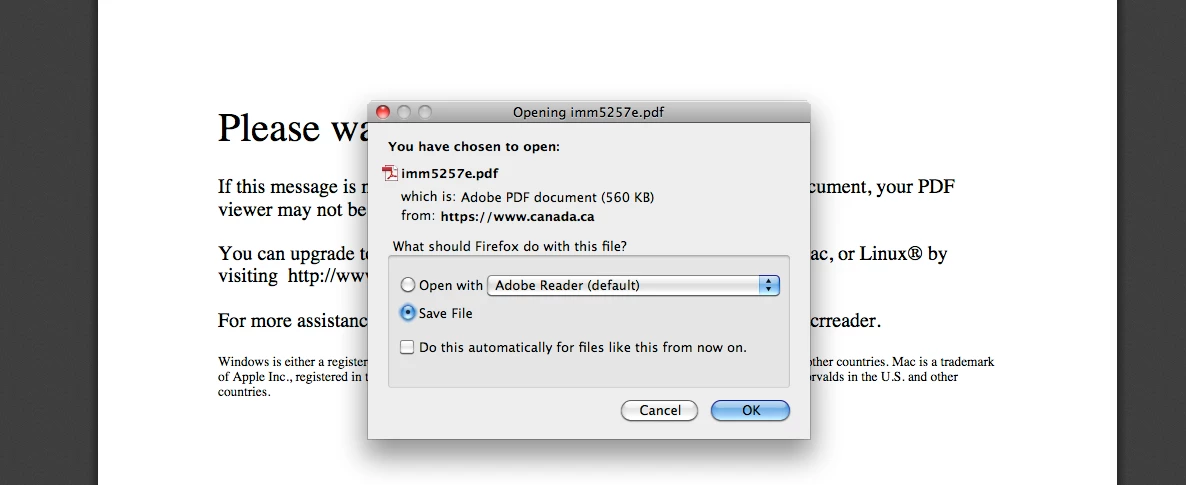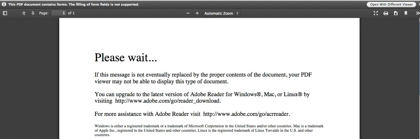 Hello. Im on a Mac OS 10.6.8 and ADobe Reader 11.0.11. When I try to download PDF forms, i get this message: