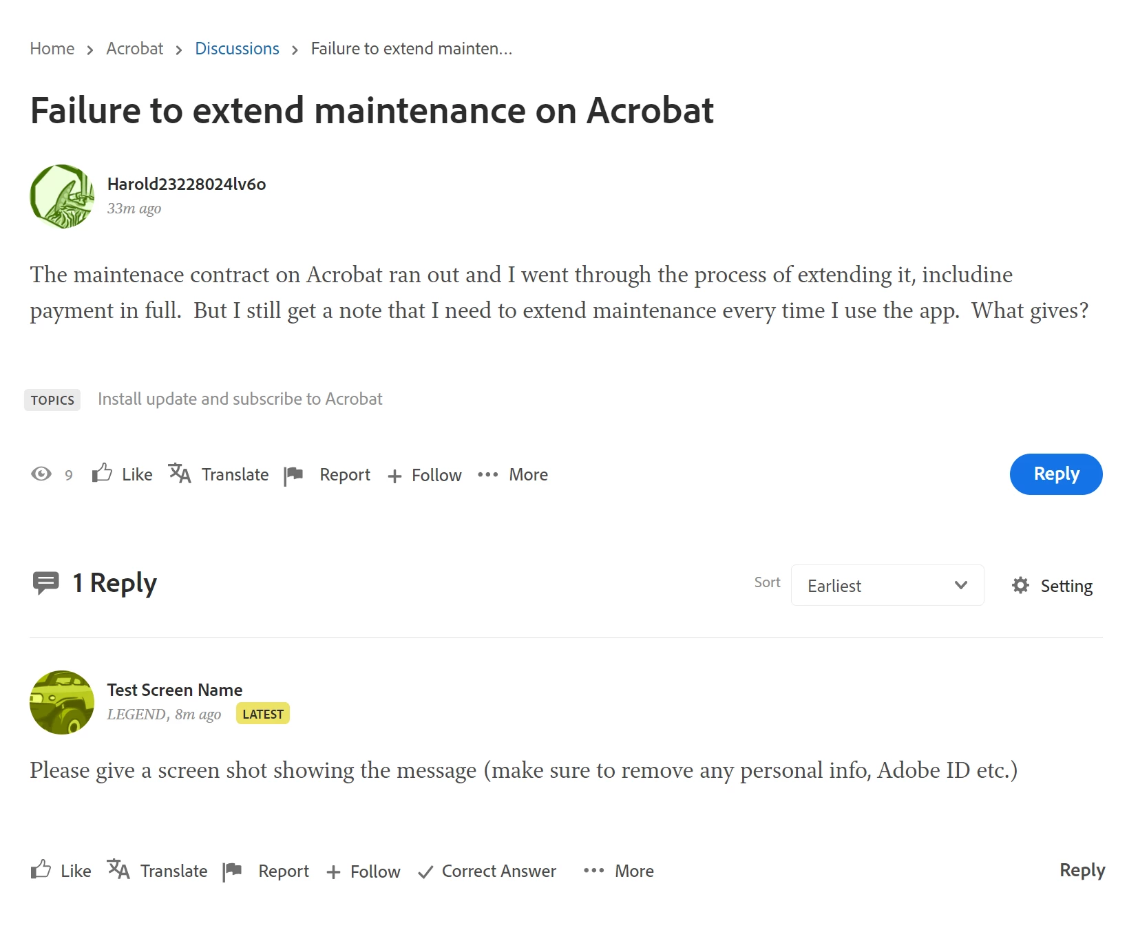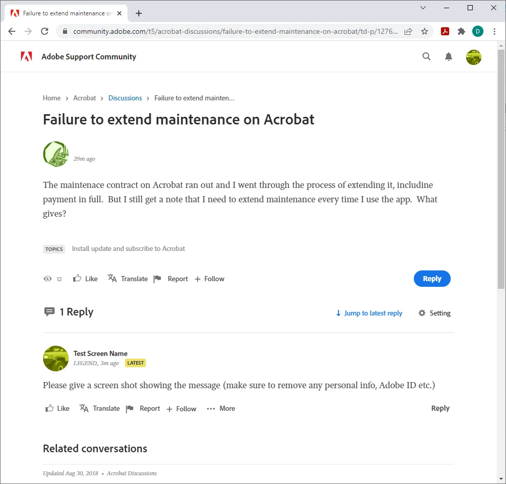 Example message: https://community.adobe.com/t5/acrobat-discussions/failure-to-extend-maintenance-on-acrobat/td-p/12761497