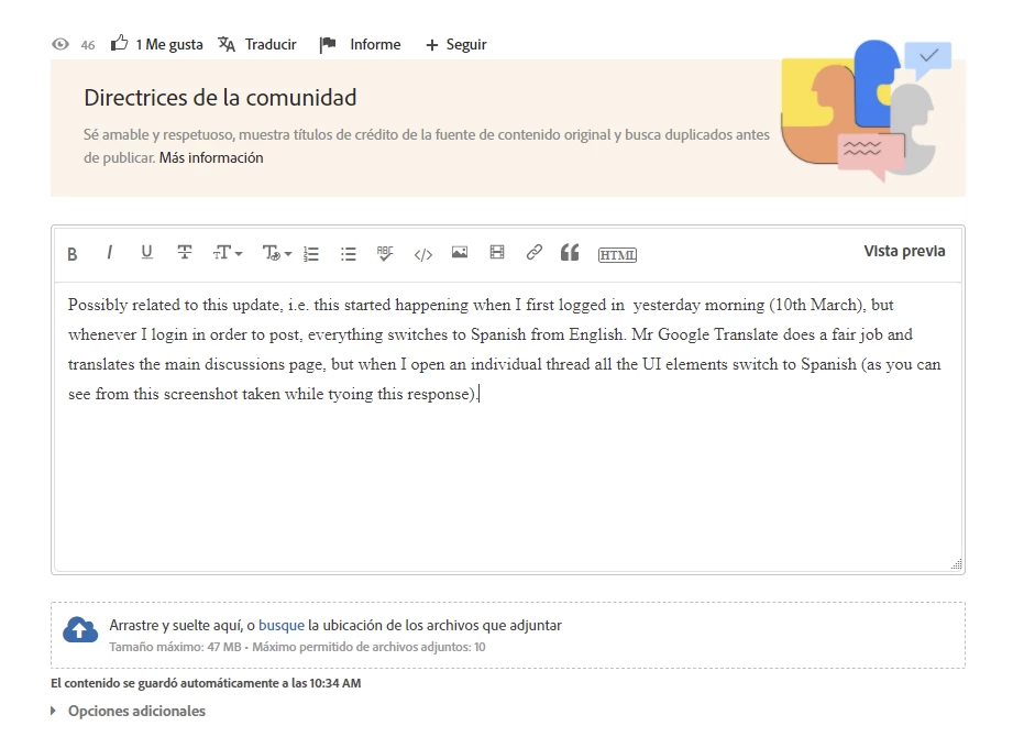 Possibly related to this update, i.e. this started happening when I first logged in yesterday morning (10th March), but whenever I login in order to post, everything switches to Spanish from English (i.e. everything is normal until I have to login to post). Mr Google Translate does a fair job and translates the main discussions page, but when I then open an individual thread all the UI elements switch to Spanish (as you can see from this screenshot taken while typing this response). All email notifications I receive are also now in Spanish.