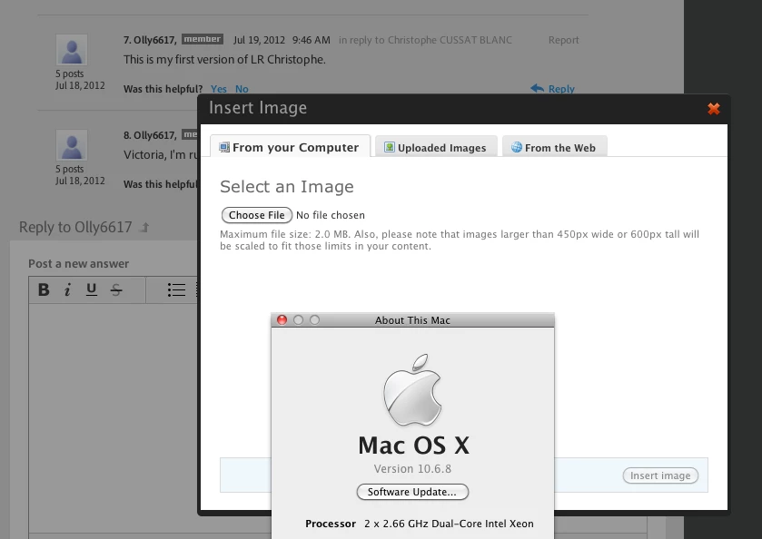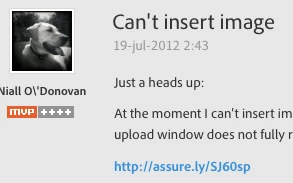 At the moment I can't insert images into forum posts. When the camera icon is clicked the upload window does not fully render: