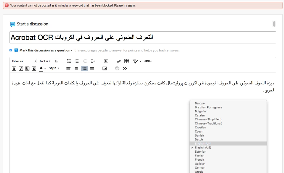 I'm initiating a discussion on the Arabic عربي forum. When I click the Post button it shows below error message…