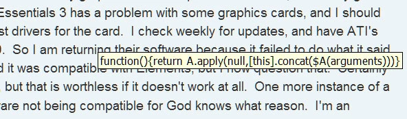 I was using CS3 on my aging HP (with XP/SP3), tried to transfer it to my new Dell. Bought a Dell m435mt (i7-920) and have 12 Gb DDR3 1333 RAM with an ATI 4850 HD 512 Mb (DDR3) card, Vista Home Premium. I wanted to upgrade to CS4, but the CS3 refusted to transfer to Vista. Contacted Tech Support at Adobe, and was told there was not yet support for Vista Premium. Later, I got a routine download or two, and still no luck transferring. It would not go on my Vista laptop either. As a result, I chose not to upgrade to CS4. I have upgraded to Photoshop Elements 8 from 7, and generally like it for the things I commonly do with photos. Having lost my photography business (not Adobe's fault), I'll stick with Elements. Then in October, I upgraded to Windows 7 Home Premium with no problems. CS3 still wouldn't install. During the Elements upgrade, Adobe had an ad for OnOnesoftware's Photo Essentials (several versions), and I decided to go for the latest, v.3 to reasonably assure it was compatible with Windows 7. It took a week, and I immediately upon receipt installed it. No problem installing. Brought it up to do some work on some Christmas card photos I was doing for friends, and while the split screen (original and modified side-by-side photo boxes so you could compare and see any transformations) came up, nothing I did could get a photo to show up. I emailed OnOne's tech support, and after A WEEK, they asked for more info on my graphics card. I replied with the info, and today got a response saying Essentials 3 has a problem with some graphics cards, and I should download the latest drivers for the card. I check weekly for updates, and have ATI's latest for the 4850. So I am returning their software because it failed to do what it said it would do. It said it was compatible with Elements, but I now question that. Certainly looks easy to use, but that is worthless if it doesn't work at all. One more instance of a third party's crapware not being compatible for God knows what reason. I'm an experienced (since 1983) computer user, though no tech or expert. I hope they will provide the full refund they claim to offer (within 30 days of purchase). Just a caution to anyone who is considering getting this software. Could it be my computer? Possibly, but I'm pretty standard, with default installations. It's sad that Adobe offers 3rd party products either it hasn't tested, or doesn't keep up with.