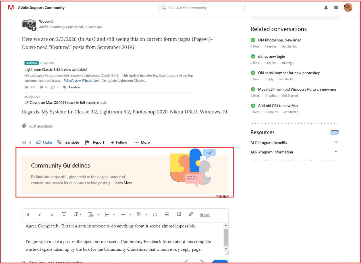 Why Oh Why is the banner, and why oh why is there a banner at all, for placing a link to the community guidelines on every reply page.