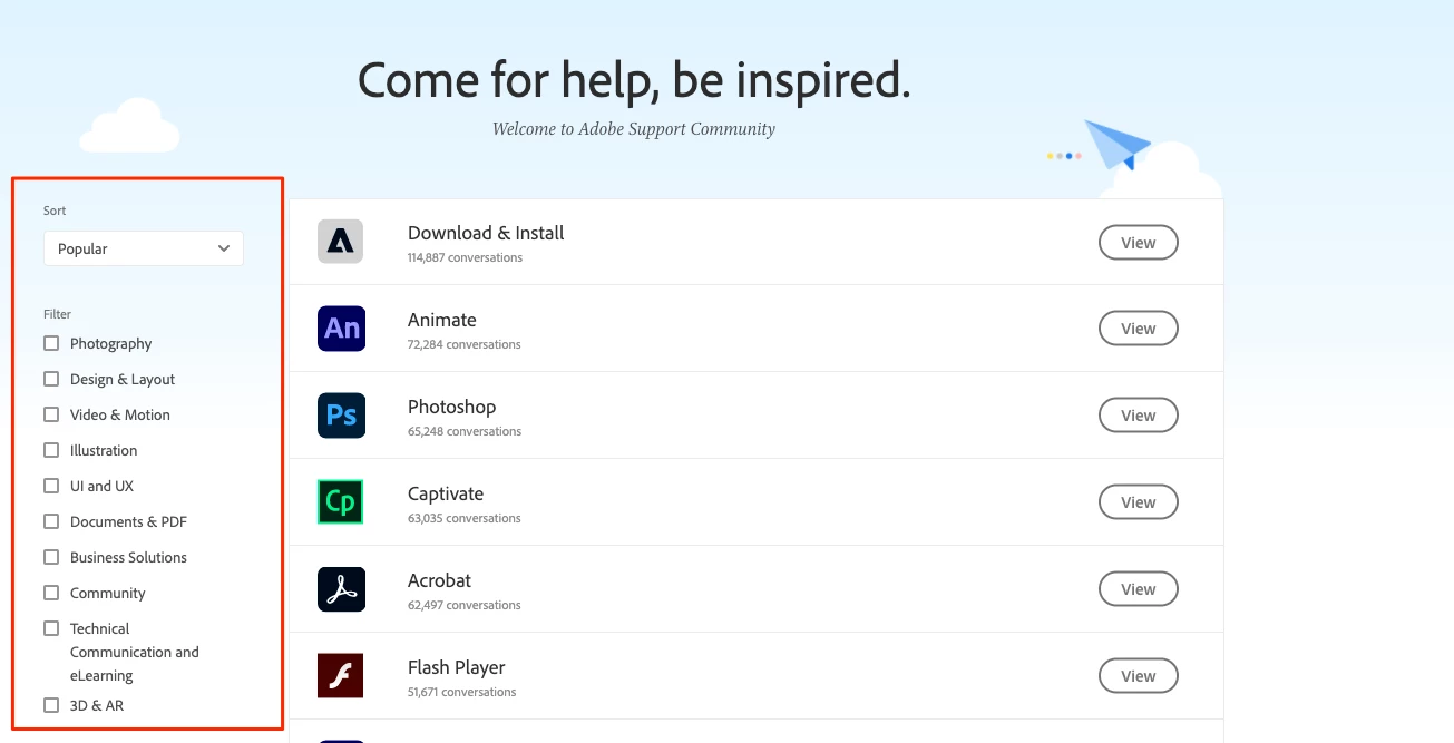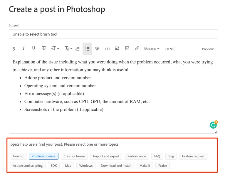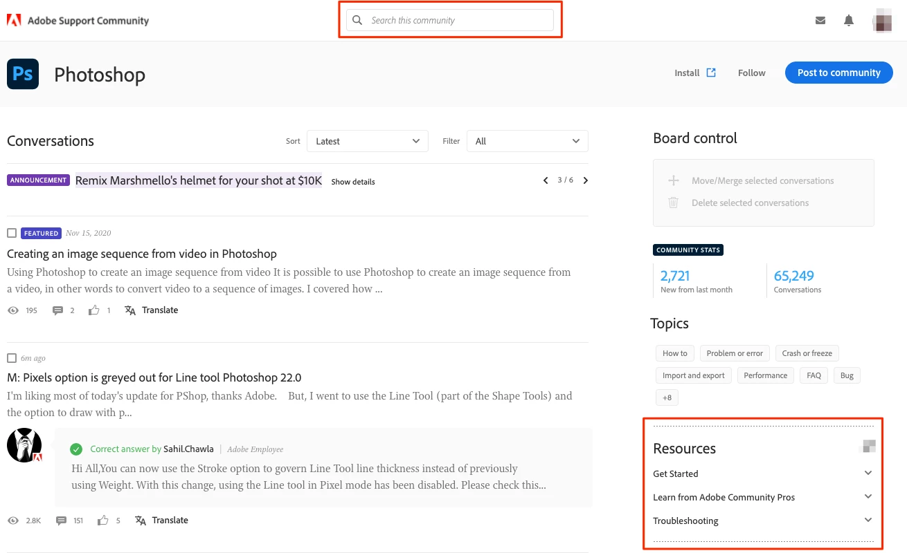 Navigate through the relevant community (.e.g Photoshop) or use the built-in search at the top of the screen to check if your question/issue has already received an answer from a different user. This will also help to prevent duplicate posts.