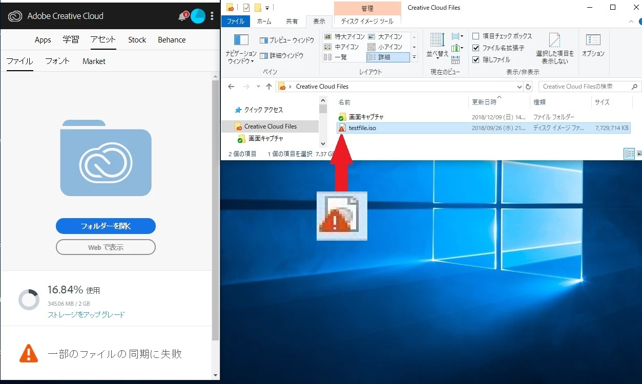 7GBのファイルをCreative Cloudフォルダへコピーして再現しました。