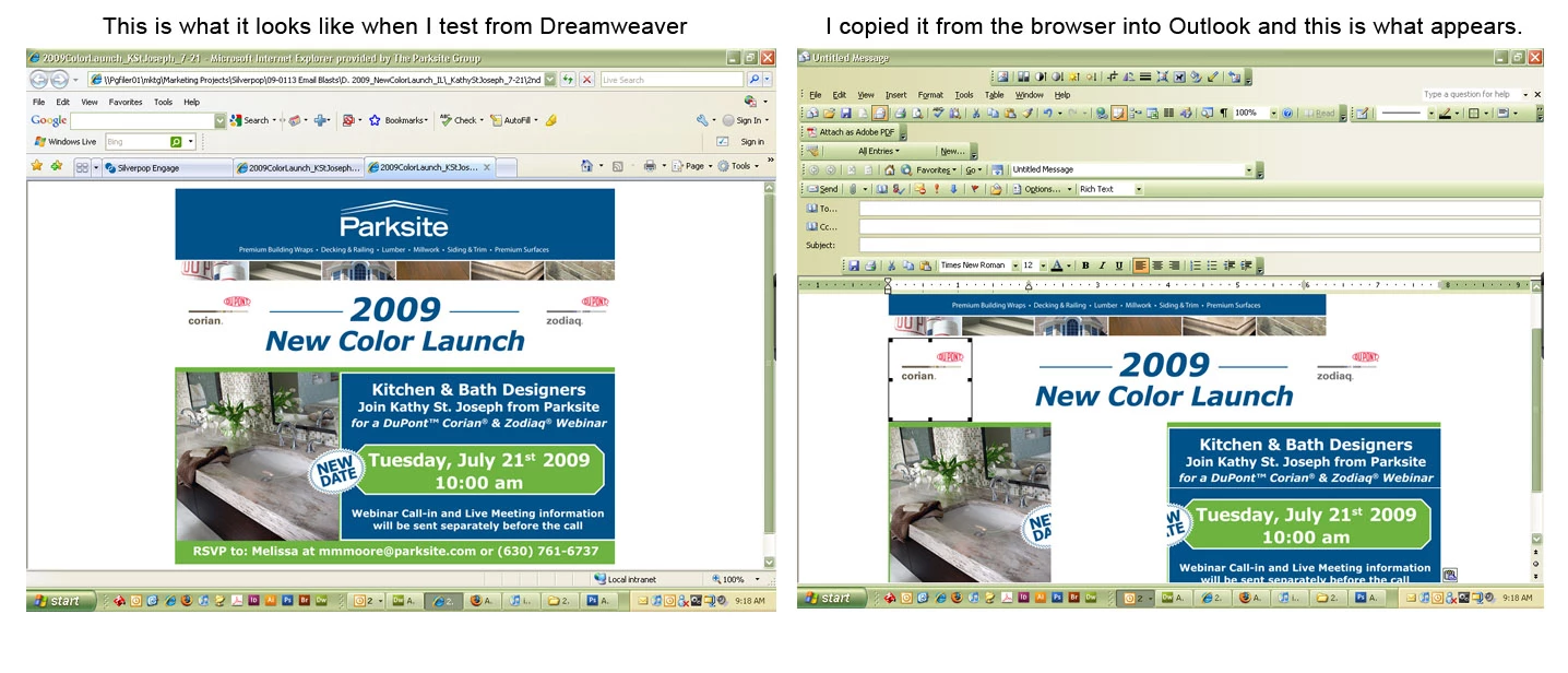 When you copy and paste html from explorer or firefox into Outlook the images shift. I created the original file in Photoshop, sliced and exported for the web. I then opened the html in Dreamweaver and placed into a table and set margins for 25 all sides. I thought that would resolve the issue but I thought wrong. Then when the email is forwarded on it shifts even more. Please help.
