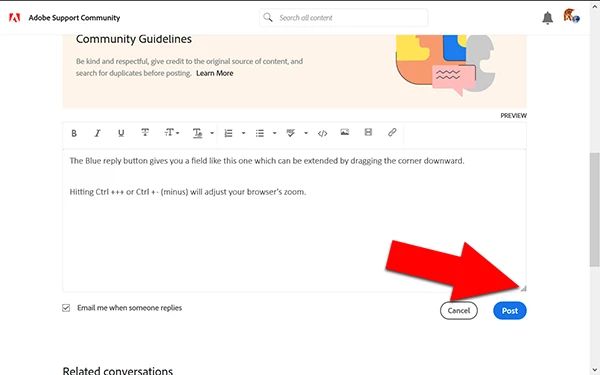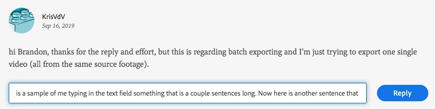 Hopefully this is the right place to post this. I have a feature request on the forums that will make it easier to use for people responding to a posted question. Could we get a larger text field to type in when we respond to a post, like how when we initially create a post? I'll attach an example. Any responses longer than two sentences oftentimes gets cut off to where it's hard to see all of the information at once. It would be nice to at least I the corner at the bottom right corner of the text field be able to drag down to make the text field bigger so that I can see my entire text all at once.