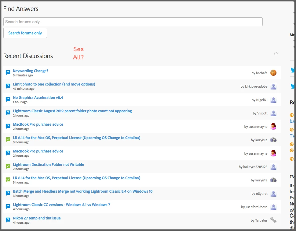 I always look for a "See All" type of link, right near the Recent Discussions section. It screams out to have something like that there. All there is a More button, and it loads a few more, and that's it. No more, no all...