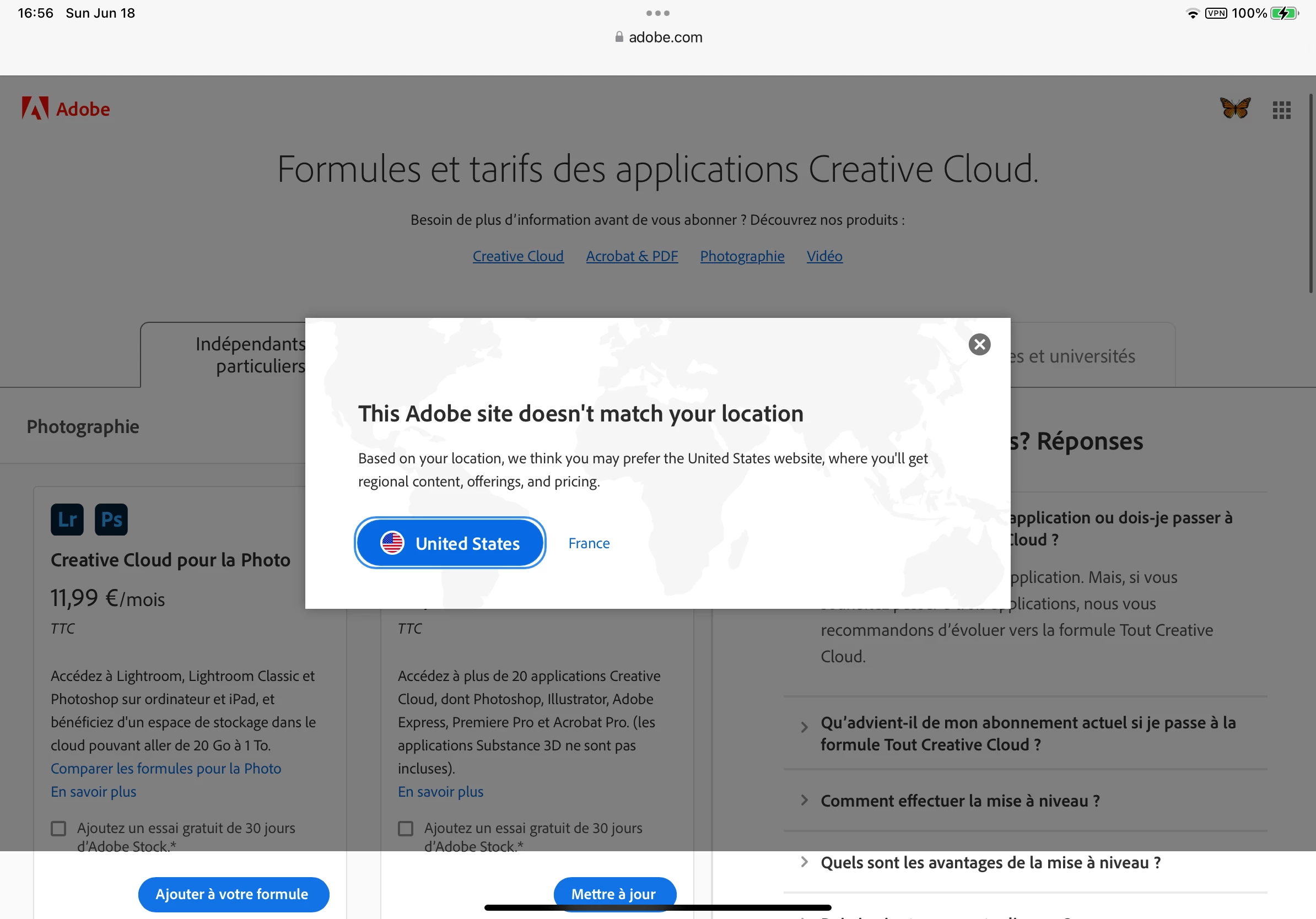 If you are in the US, you are probably unaware of this, but when you google how to do something in an Adobe product and inevitably get a result from adobe.com, clicking through from another place in the world pups this annoying popup over whatever page you go to: