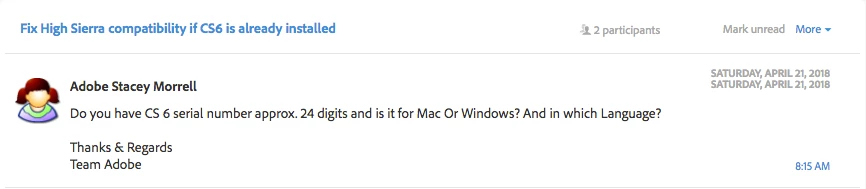Someone pretending to be Adobe support just contacted me, asking for my product serial number, whether it was for Mac or Windows, and what language my product was in. I'd love to be able to report them (or something of the sort), but there doesn't appear to be a way to do this.