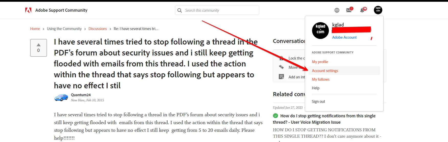 I have several times tried to stop following a thread in the PDF's forum about security issues and i still keep getting flooded with emails from this thread. I used the action within the thread that says stop following but appears to have no effect I still keep getting from 5 to 20 emails daily. Please help!!!!!!!
