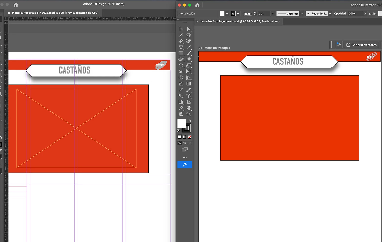 - Screenshot taken in InDesign 2026 of the file “ReportajeSIP Abril 2026.indd” → shows the gray/green placeholder on the placed image (page 2).