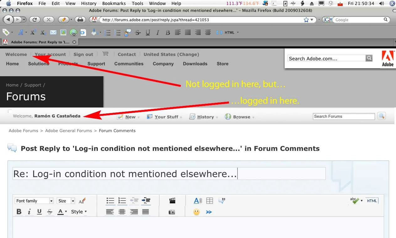 Every once in a while I've noticed that I'll log-in, or return to the forums from elsewhere (another domain) and see that I'm logged in to the forums, but at the very top left of the page I'll see that I'm NOT logged in to my Adobe account. I can't discern any pattern in how or when or under what conditions this will occur. It could be that it's happening while the system is being tweaked on the back-end; of course there's noway for me to know when that situation is occuring.