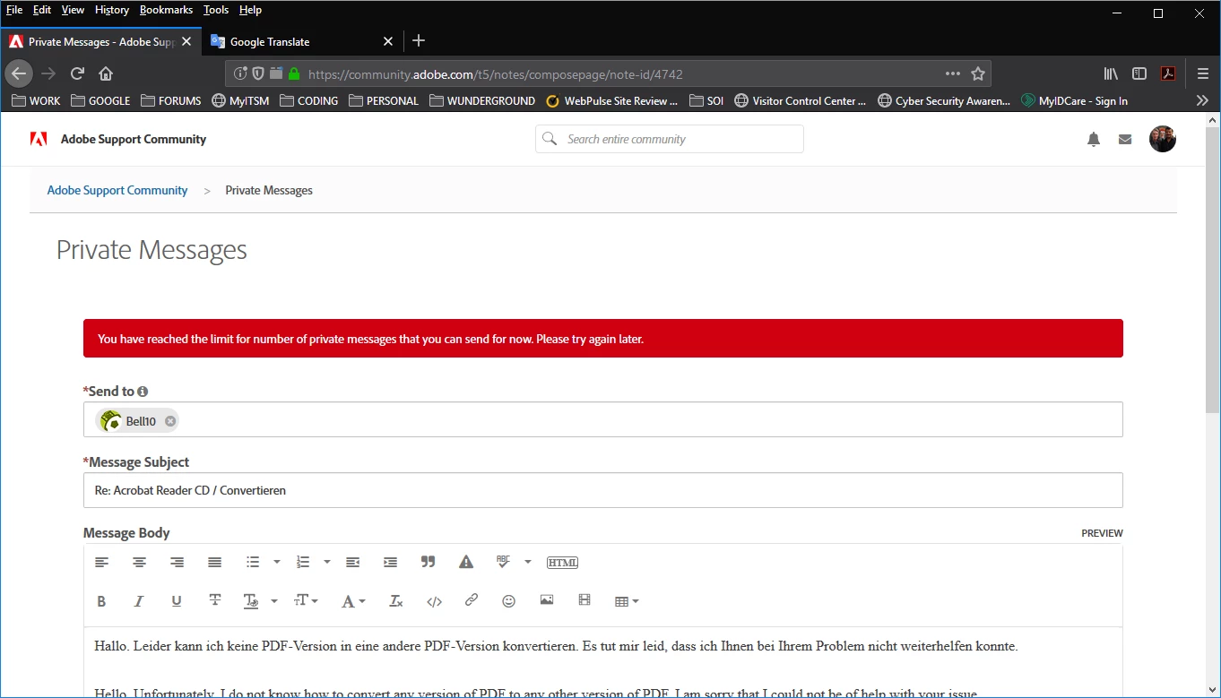 I recently was PMd from someone in Germany (I assume; the question was in German) asking about PDF stuff in ColdFusion. I attempted to reply, but when I hit the submit button, I got a message (see screencap) that I've reached the limit of PMs that I can send.