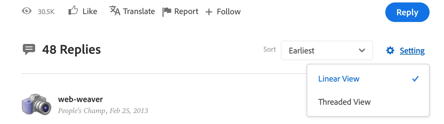 No threading controls for Bugs and Ideas subforums of Lightroom Classic forum