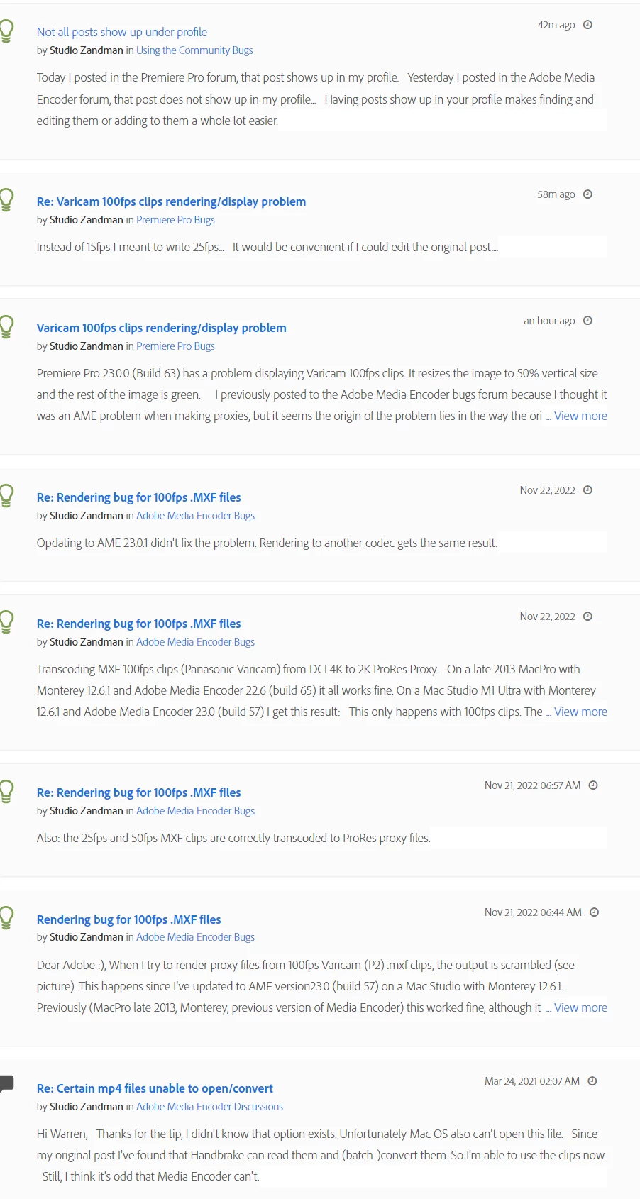 Yesterday I posted in the Adobe Media Encoder forum, that post does not show up in my profile...