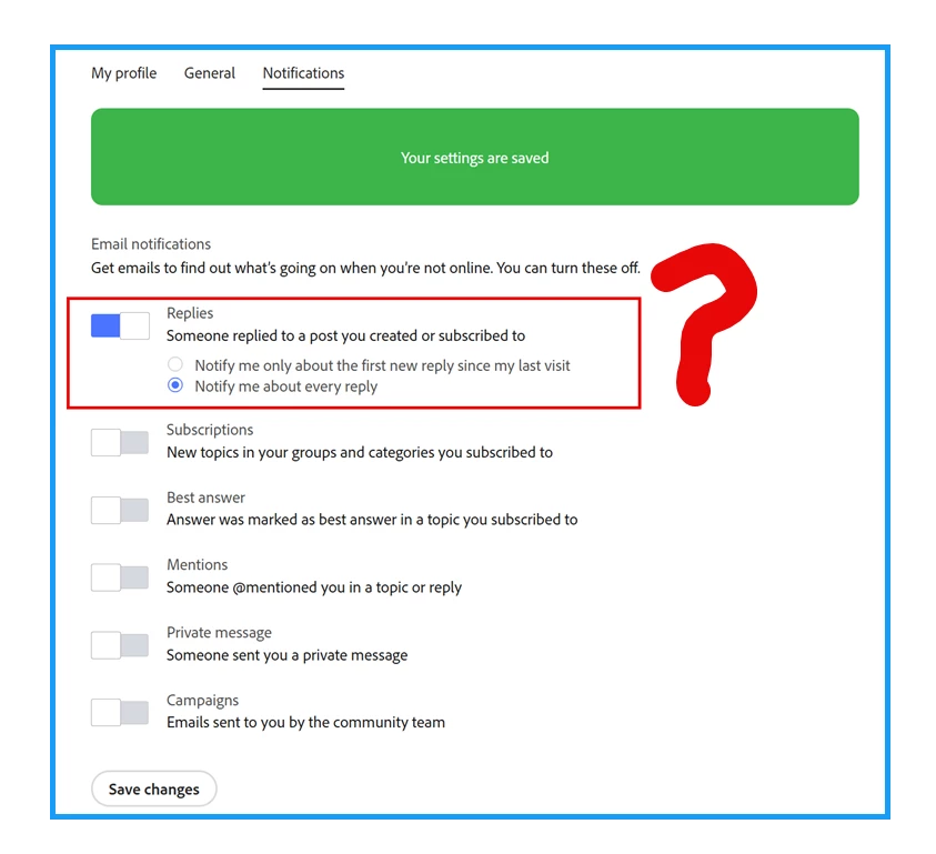 I am not getting any notification for replies. Is this setting correct to get notification for replies?