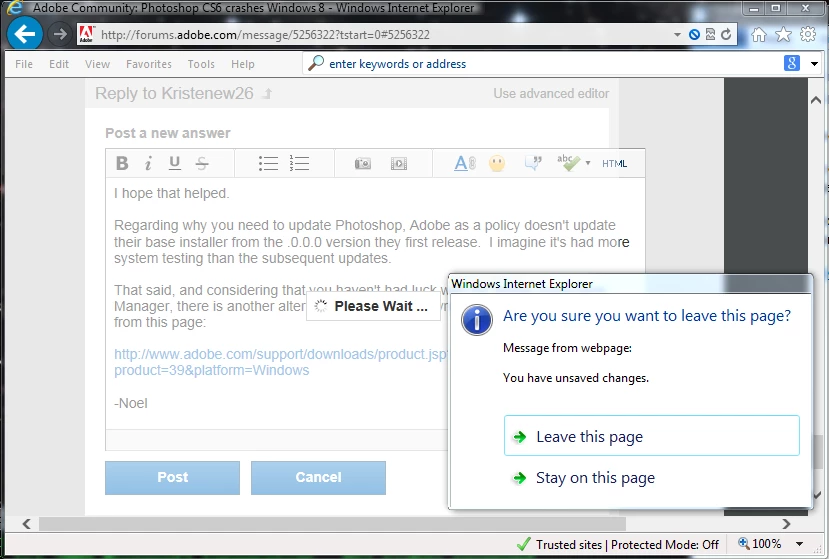 - If I choose "Stay on this page" it just sits there showing "Please Wait" forever. If I choose Leave this page, it shows this: