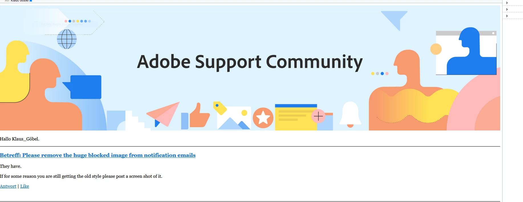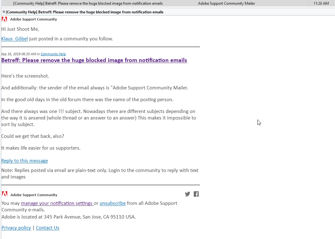 Every notification email from the new forum includes a huge image area that my Outlook blocks 'To help protect my privacy' The same content is repeated below this useless image but is offscreen which means I have to either unblock the image, or scroll down the page. All of this wastes time and makes me dislike the new forum even more.