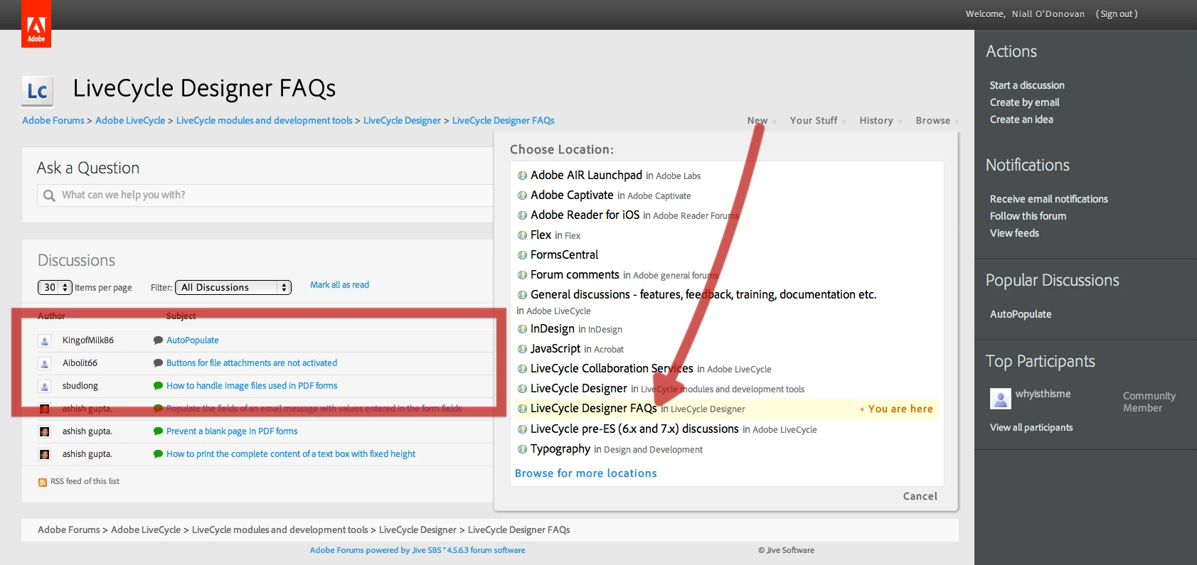 In the LiveCycle Designer FAQ page, the top three posts are general questions, best placed on the main forum page.