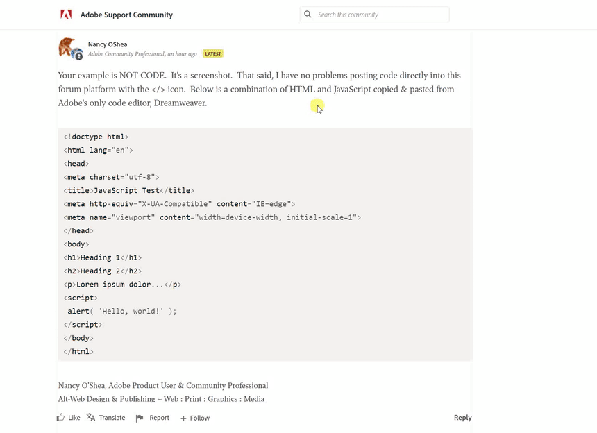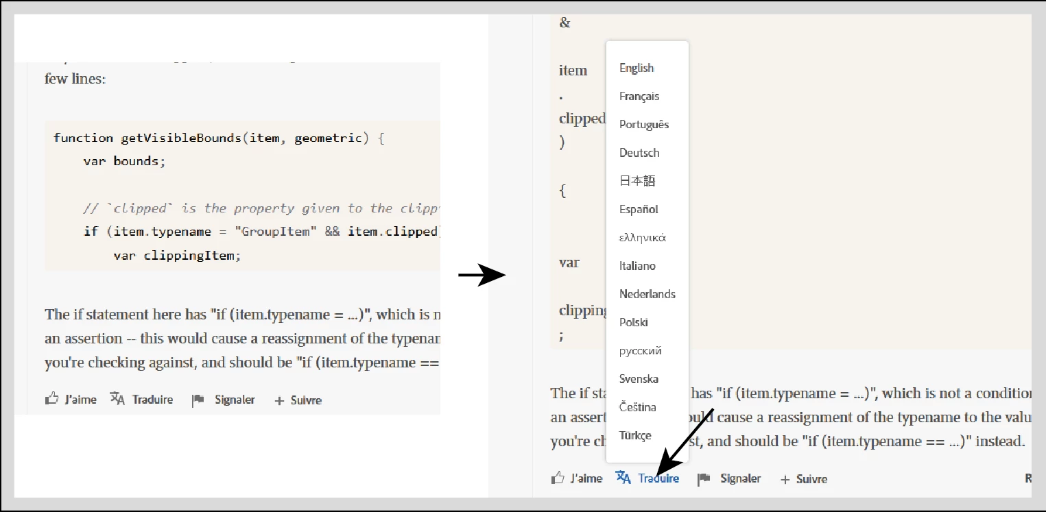 Sur ce site, depuis quelques temps, quand on clic sur le bouton traduire, le navigateur ajoute des retours chariot en remplacement des espaces dans les portions de code Javasript.