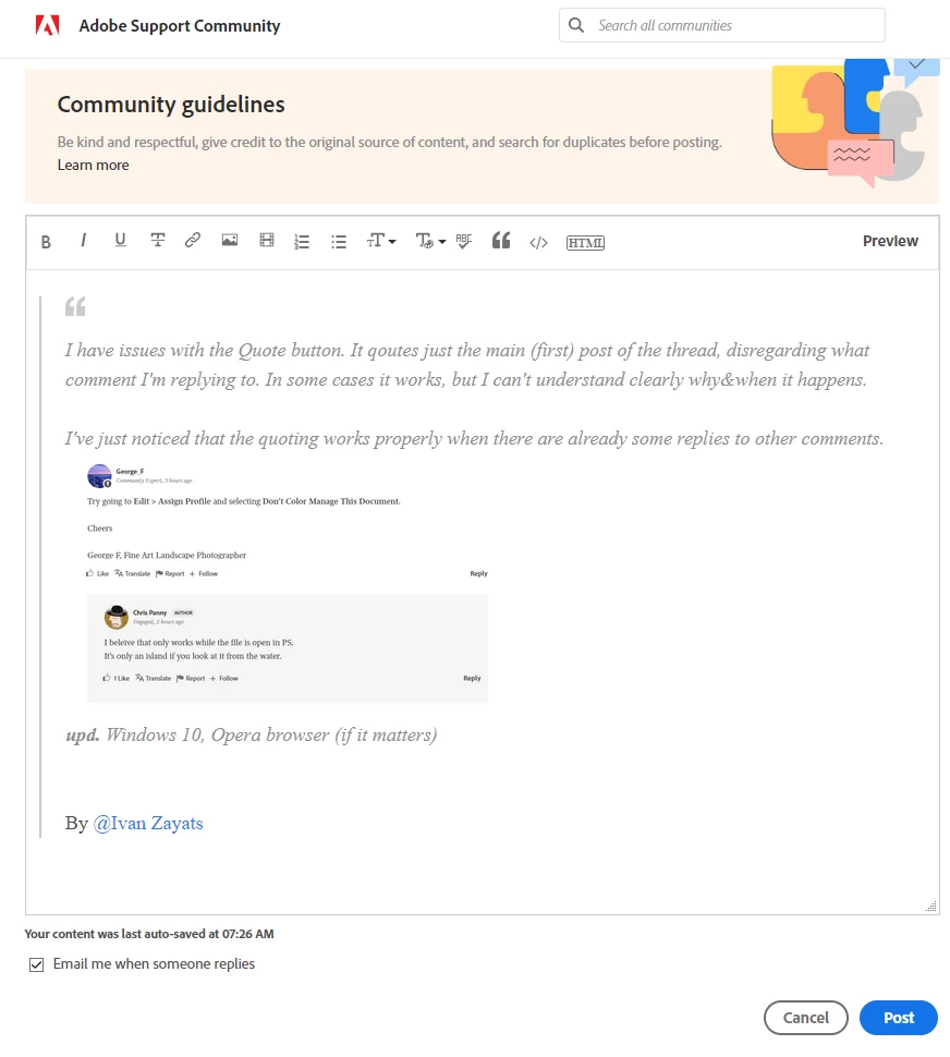 I have issues with the Quote button. It qoutes just the main (first) post of the thread, disregarding what comment I'm replying to. In some cases it works, but I can't understand clearly why&when it happens.